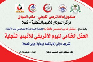 احتفل مركز السودان للأنيميا المنجلية بولاية كسلا- أحد مؤسسات صندوق إعانة المرضى الكويتي- مكتب السودان، باليوم الأفريقي للأنيميا المنجلية، ووضع حجر الأساس للمبنى الجديد للمركز، بمشاركة واسعة من الجهات الرسمية والمجتمعية، وبحضور نائب الوالي ووزير الصحة بالولاية وعدد من المسؤولين.