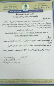 أصدر والي ولاية نهر النيل محمد البدوي عبد الماجد، قرارين بإنهاء تكليف وتكليف مديرين تنفيذيين.